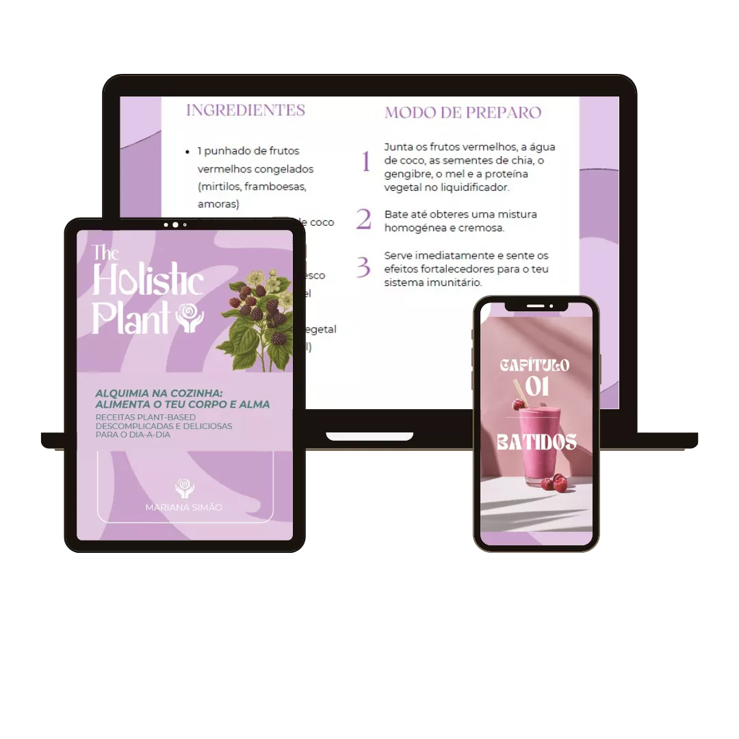 ✹ 60 receitas plant-based: batidos, bolos, snacks, refeições e molhos para as saladas.